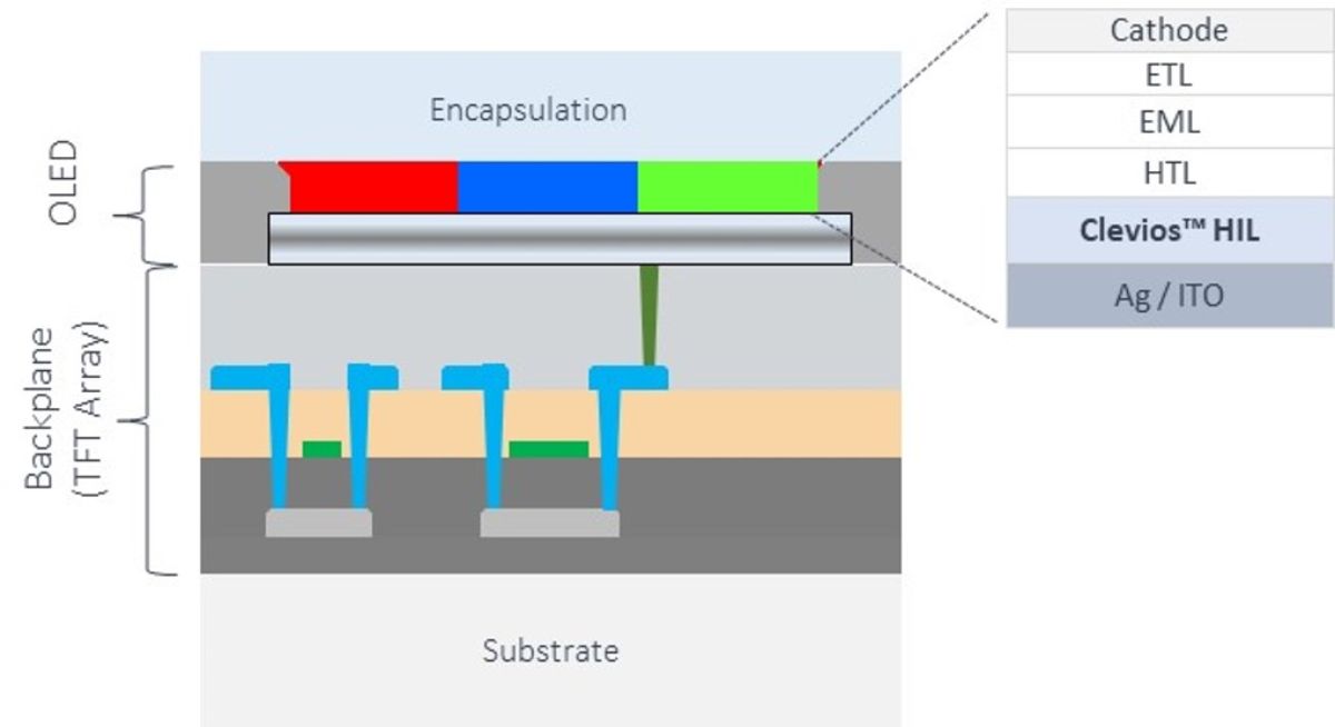 OLED(有机发光二极管)和 QLED(量子点发光二极管)技术是智能手机、平板电脑和可穿戴设备等设备中使用的柔性和可折叠显示屏开发的核心,使更薄、更轻、更节能和功能更强大的产品成为可能。Clevios™ HIL 材料提高了 OLED 显示屏的性能和加工工艺,同时也使其更具成本效益。